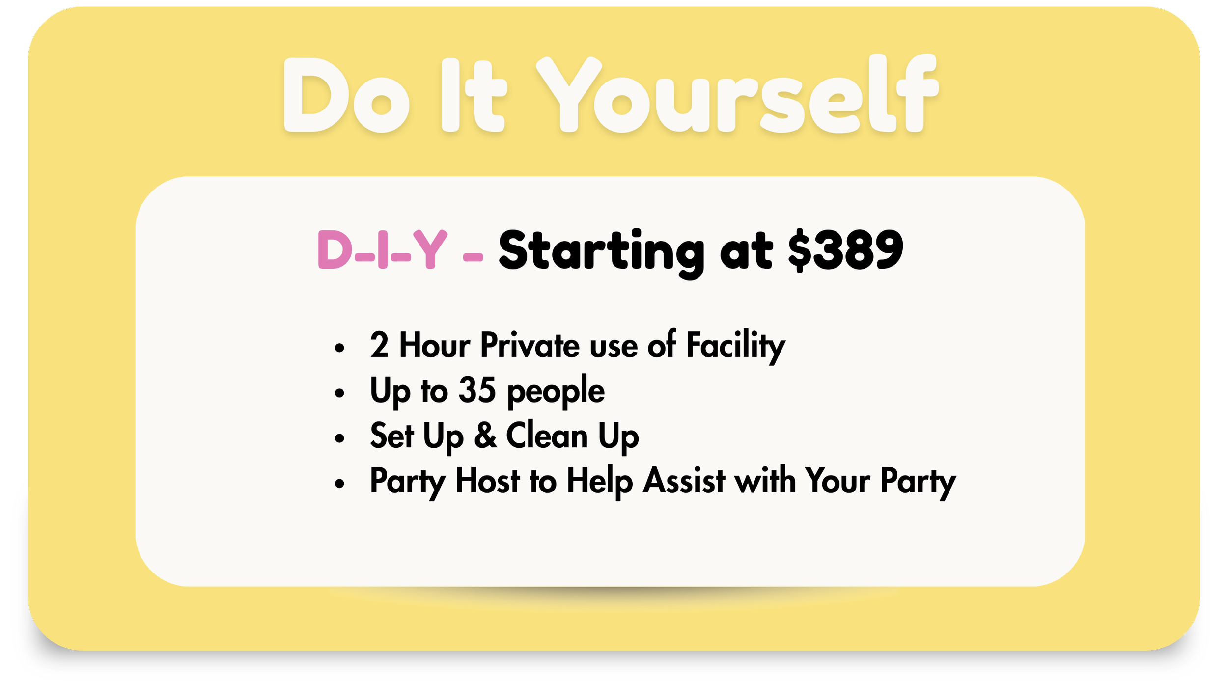 Great Question! There’s a big difference. The full service parties hosted at our Play Centre location are inclusive of all decorations, food, beverages, and 2 party hosts, Once you arrive, you literally do not have to lift a finger, we will take care of everything at your party. With the DIY party you’ll have to bring your party gear, food, beverages etc and you only have one party host which means, we’ll definitely need you to help us during your party