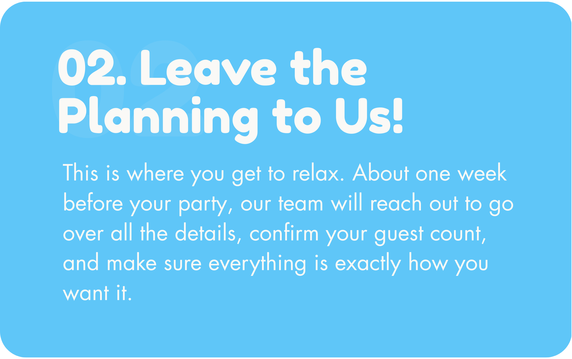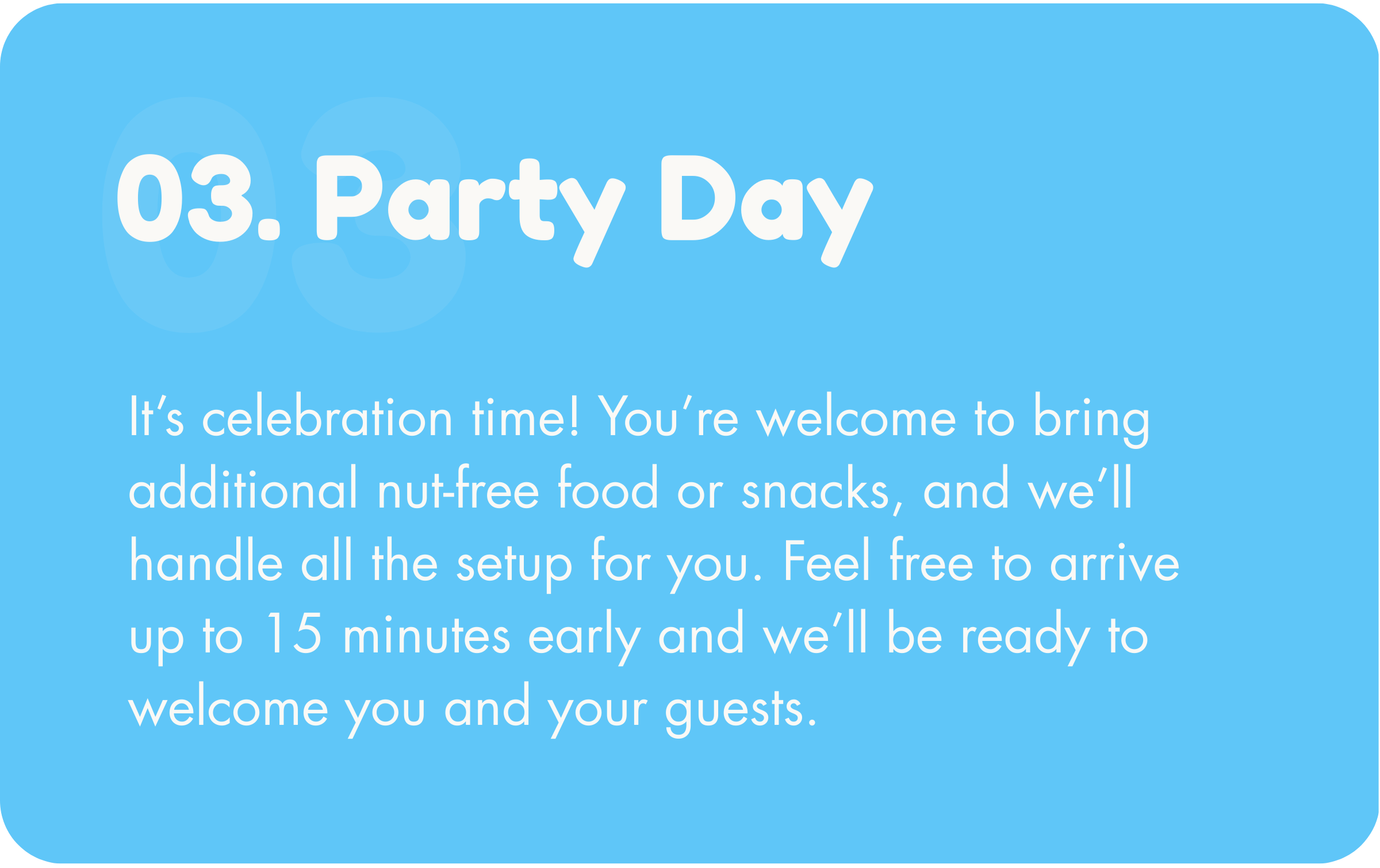 Here’s the great part, we will set everything up for you so it's ready when you arrive. You are welcome to arrive a maximum of 10 minutes before you party start time.